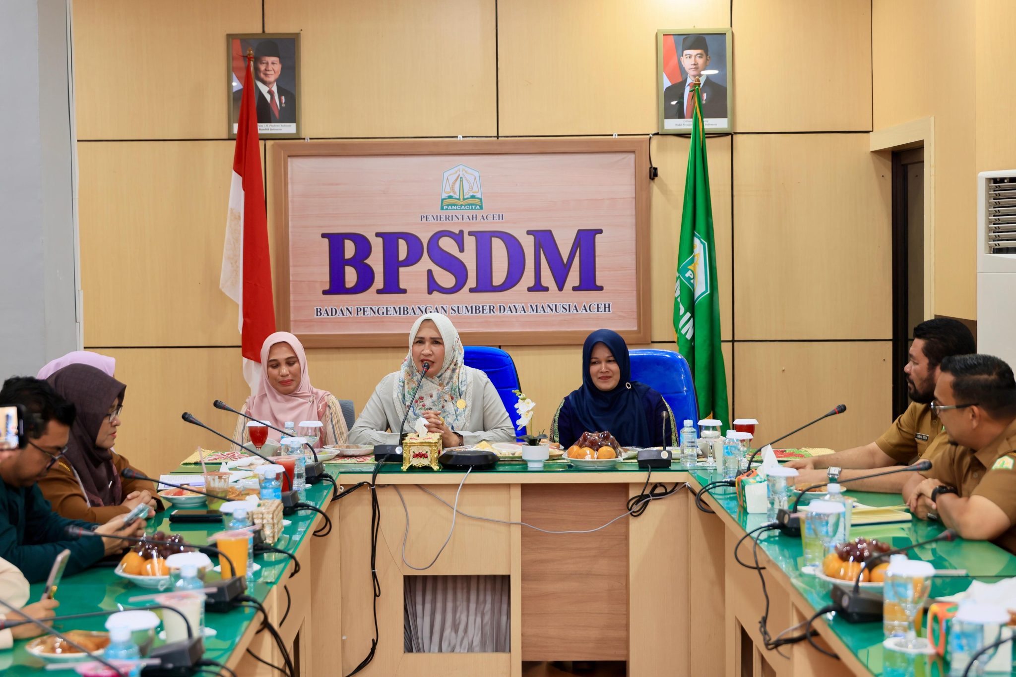 Bunda PAUD Aceh, Marlina Muzakir, didampingi Ketua POKJA Bunda PAUD Aceh, Mukarramah Fadhlullah, dan Wakil Ketua POKJA Bunda PAUD Aceh, Malahayati M. Nasir, melakukan audiensi dengan Sekretaris BPSDM Aceh, Faisal Reza, S.Sos, MPA, dalam rangka dukungan program beasiswa untuk guru PAUD, di Kantor BPSDM Aceh, Selasa (16/9/2025).