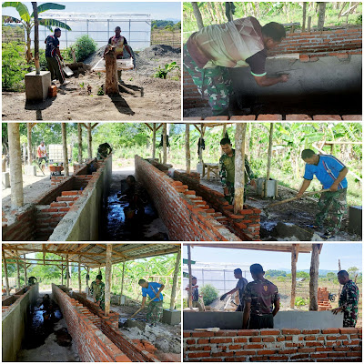 Tampak prajurit TNI bekerja sigap menyusun bata demi bata, membentuk dinding kokoh yang kelak menjadi kandang sapi yang layak dan nyaman.