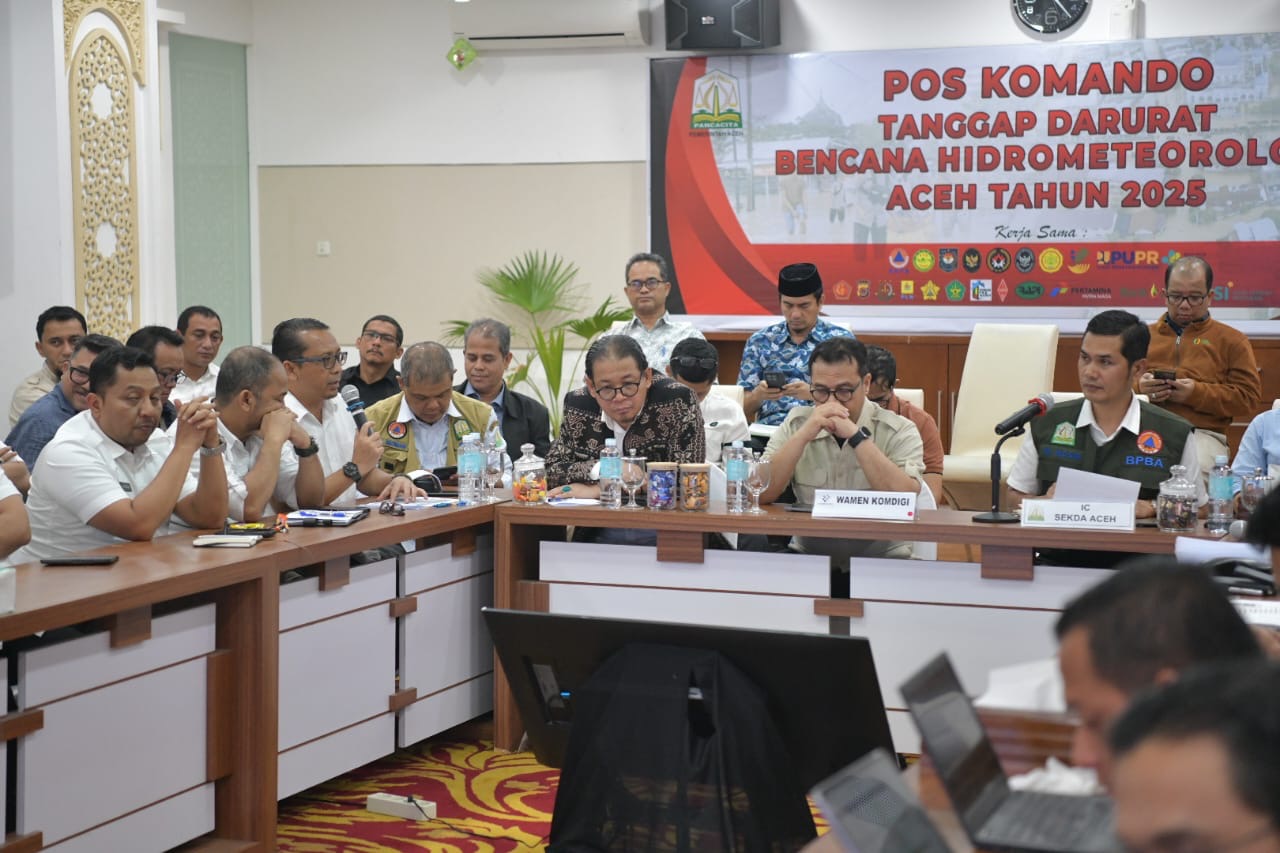 BERITA RAKYAT ACEH | Banda Aceh – Sekda Aceh M. Nasir menegaskan bahwa fokus utama pemerintah saat ini adalah percepatan distribusi logistik dan pembukaan kembali akses jalur darat di wilayah terdampak bencana hidrometeorologi. Penegasan itu disampaikan dalam rapat evaluasi penanggulangan bencana yang digelar di Posko Kantor Gubernur Aceh, Rabu 3/12/2025. Rakor diikuti juga Wamen Komdigi Nezar Patria dan seluruh instansi terkait.