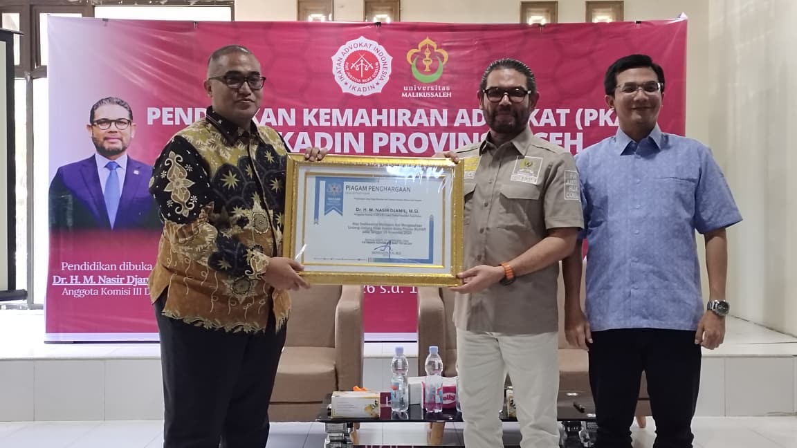Penyerahan penghargaan tersebut berlangsung di Aula Sekretariat DPD RI Asal Aceh, Banda Aceh, Selasa 10 Februari 2026, dan disaksikan oleh peserta Pendidikan Kemahiran Advokat (PKA) yang diselenggarakan DPD IKADIN Aceh bekerjasama dengan Fakultas Hukum Universitas Malikussaleh (Unimal).