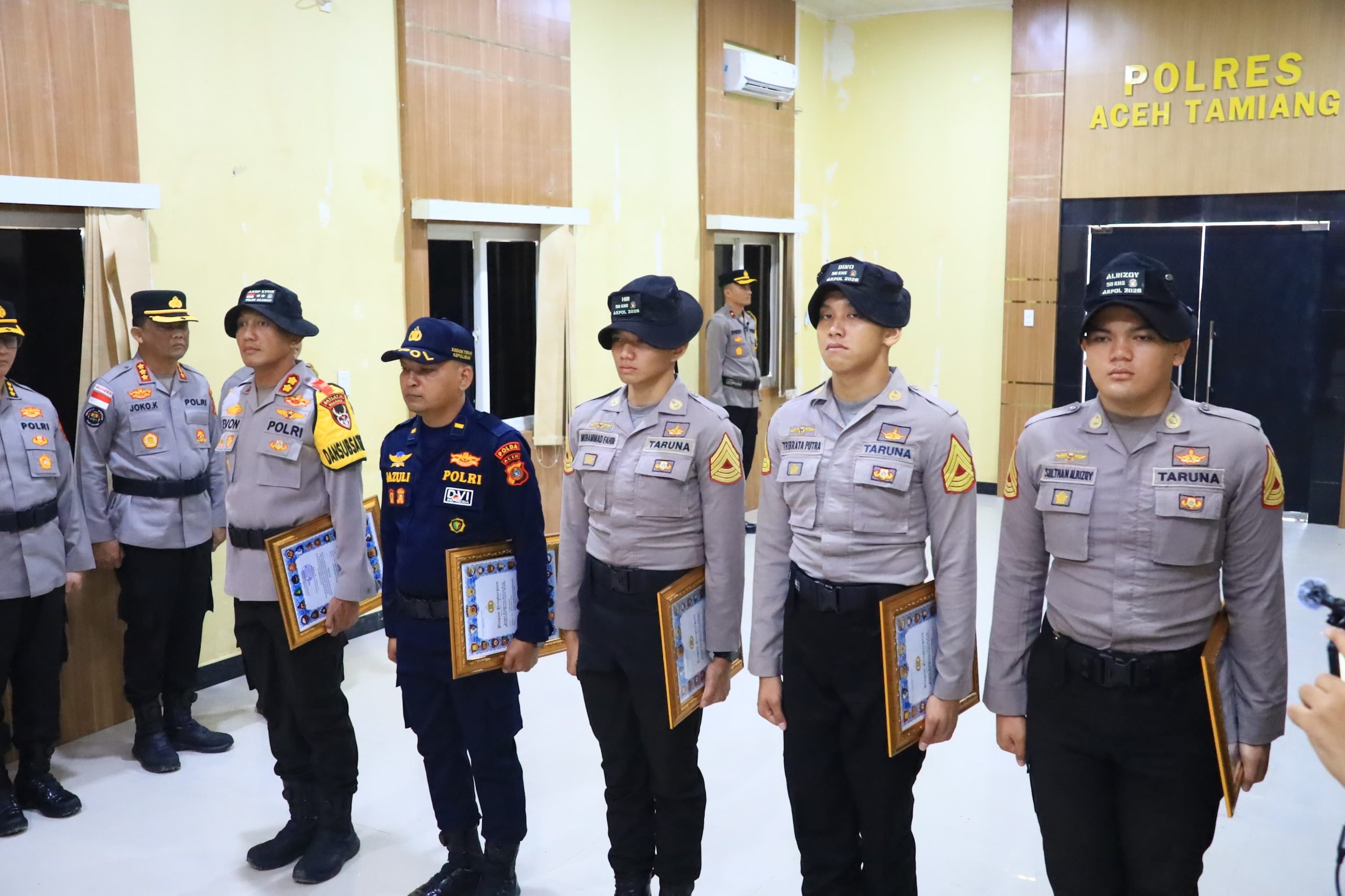 Penyerahan penghargaan berlangsung di Gedung Wira Satya Pradana, Mapolres Aceh Tamiang, Jumat (6/2/2026). Penghargaan tersebut diberikan sebagai bentuk apresiasi institusi Polri atas dedikasi, keberanian, dan kepedulian para taruna serta personel dalam membantu masyarakat pada masa tanggap darurat.