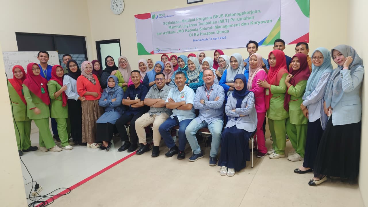 BERITA RAKYAT ACEH I Banda Aceh – Dalam upaya meningkatkan kesejahteraan dan perlindungan bagi seluruh tenaga kerja, manajemen RS Harapan Bunda menggelar kegiatan sosialisasi program jaminan sosial ketenagakerjaan. Acara ini fokus pada pemahaman mendalam mengenai manfaat program BPJS Ketenagakerjaan (BPJSTK), Manfaat Layanan Tambahan (MLT) Perumahan, serta optimalisasi penggunaan aplikasi Jamsostek Mobile (JMO).(15/4/26)