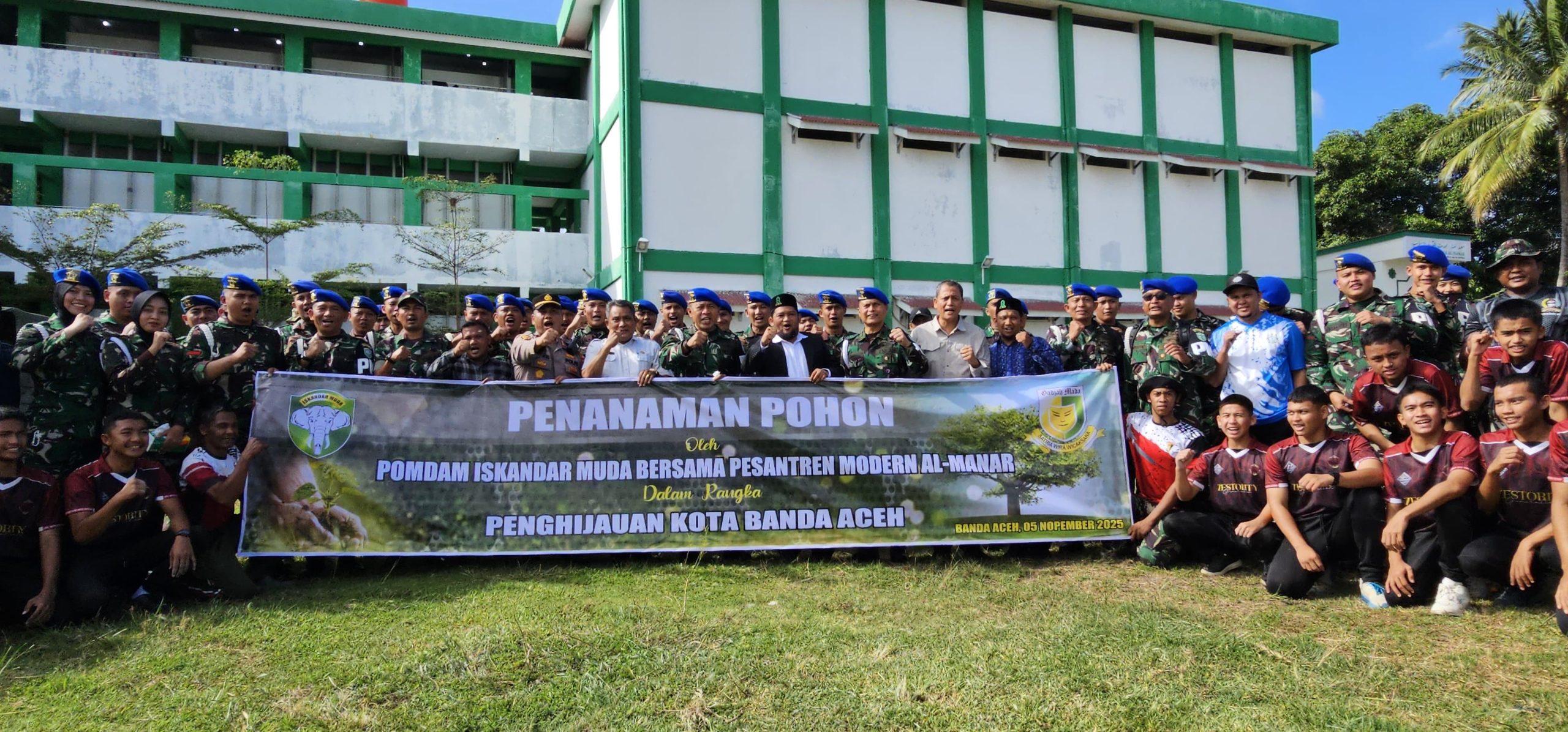 BERITA RAKYAT ACEH | Aceh Besar – Danpomdam IM Kolonel Cpm Imran Ilyas, S.H., M.H., menyalurkan bantuan sembako dan sekaligus penanaman pohon di Pesantren Modern Almanar di Krueng Barona Jaya, Rabu (5/11/25).
