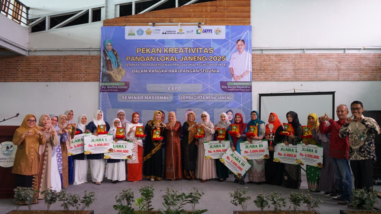 BERITA RAKYAT ACEH | Banda Aceh – Ketua Staf Ahli TP PKK Aceh, Mukarramah Fadhlullah, secara resmi menutup Pekan Kreativitas Pangan Lokal Janeng 2025 yang mengusung tema “Gerakan Sadar Diversifikasi Pangan Lokal Aceh (Garda Pala)” dalam rangka memperingati Hari Pangan Sedunia, Rabu (16/10/2025) di Kuala Village Resto, Banda Aceh.