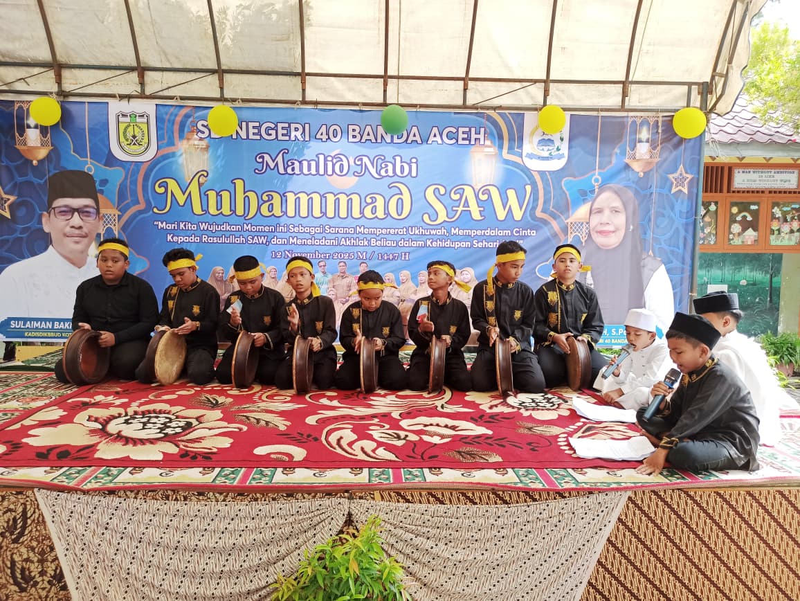 BERITA RAKYAT ACEH I Banda Aceh – Dalam rangka memperingati Maulid Nabi Muhammad SAW 1447 Hijriah, SD Negeri 40 Kota Banda Aceh menggelar kegiatan keagamaan yang sarat makna pada hari Selasa, 12 November 2025, bertempat di halaman sekolah. Kegiatan ini mengusung tema “Mari Kita Wujudkan Momen ini Sebagai Sarana Mempererat Ukhwah, Memperdalam Cinta Kepada Rasulillah SAW, dan Meneladani Akhlak Beliau dam Kehidupan Sehari-hari”.