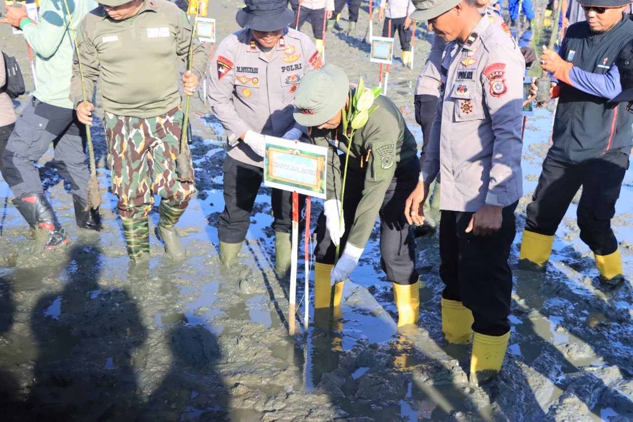 BERITA RAKYAT ACEH | Banda Aceh — Polda Aceh melaksanakan kegiatan penghijauan dengan menanam 10.000 bibit pohon mangrove di Desa Alue Naga, Kecamatan Syiah Kuala, Kota Banda Aceh, Jumat, 30 Januari 2026. Kegiatan ini merupakan bagian dari program Green Policing sebagai bentuk kepedulian Polri terhadap pelestarian ekosistem pesisir.