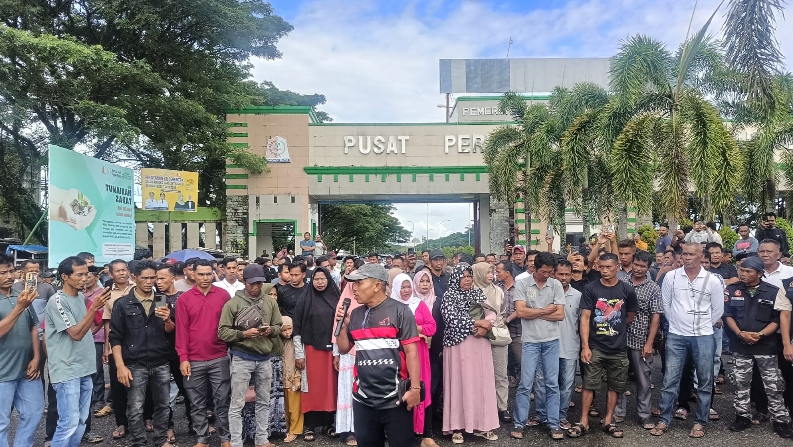 BERITA RAKYAT ACEH | Suka Makmue- Ratusan masyarakat penambang emas di Nagan Raya sambut kehadiran tim satuan tugas khusus (Satgassus) penertiban tambang bentuk Gubernur Aceh, Sabtu, (04/10/2025) di gerbang Lueng Baro menuju kompleks perkantoran Suka Makmue