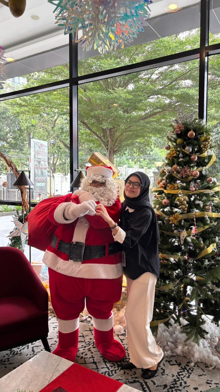 Tak hanya itu, suasana Natal semakin terasa dengan kehadiran Santa Claus di area lobby hotel yang secara khusus menyapa dan membagikan berbagai makanan ringan seperti bolu, lollipop, yupi, jelly, dan aneka snack favorit anak-anak. Momen ini menjadi daya tarik tersendiri, terutama bagi tamu keluarga yang menginap bersama buah hati mereka. Sebagai bagian dari rangkaian perayaan, para tamu juga diberikan kesempatan untuk berfoto bersama Santa Claus, menciptakan pengalaman menginap yang berkesan dan penuh cerita di Hari Natal.